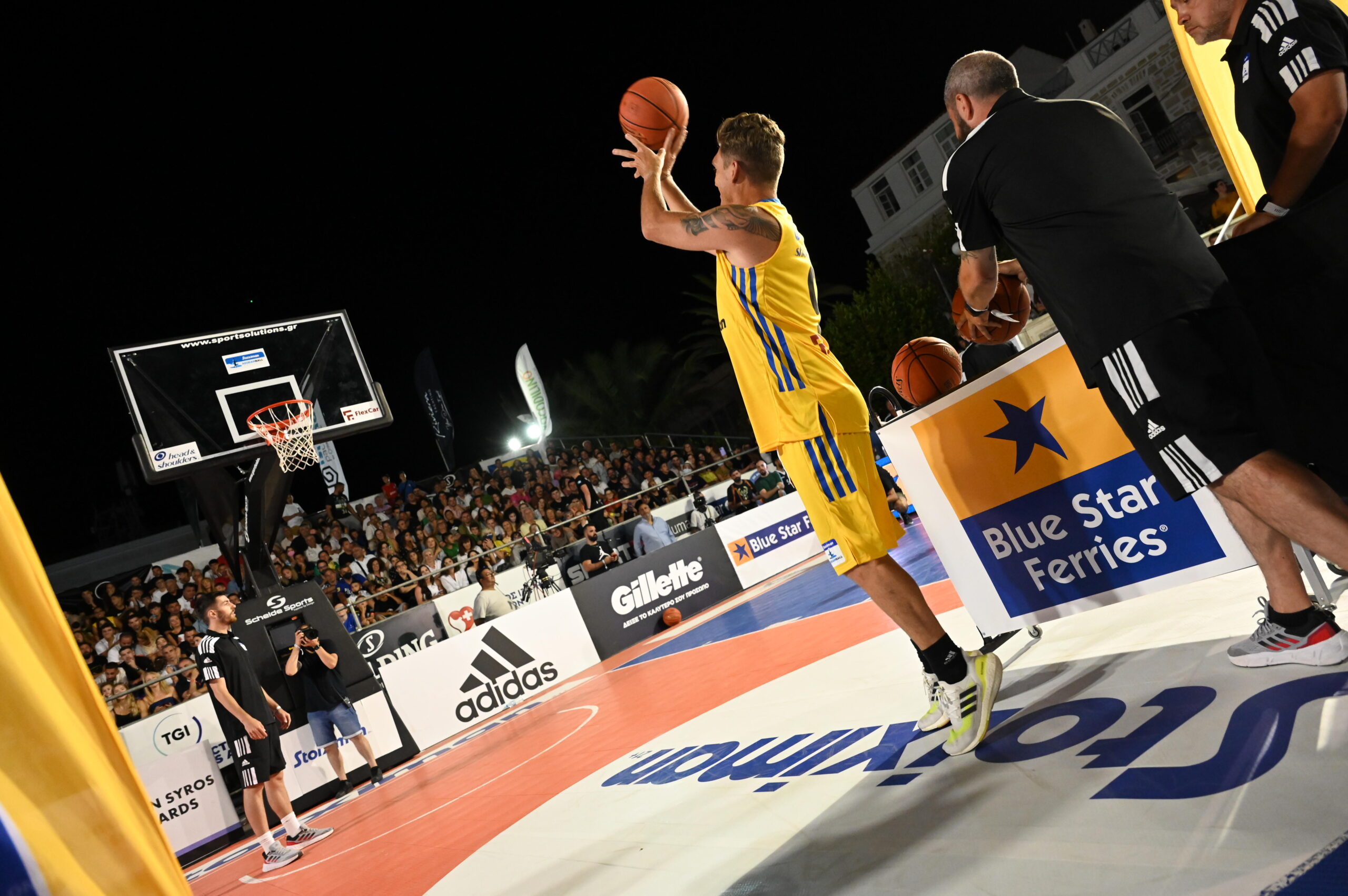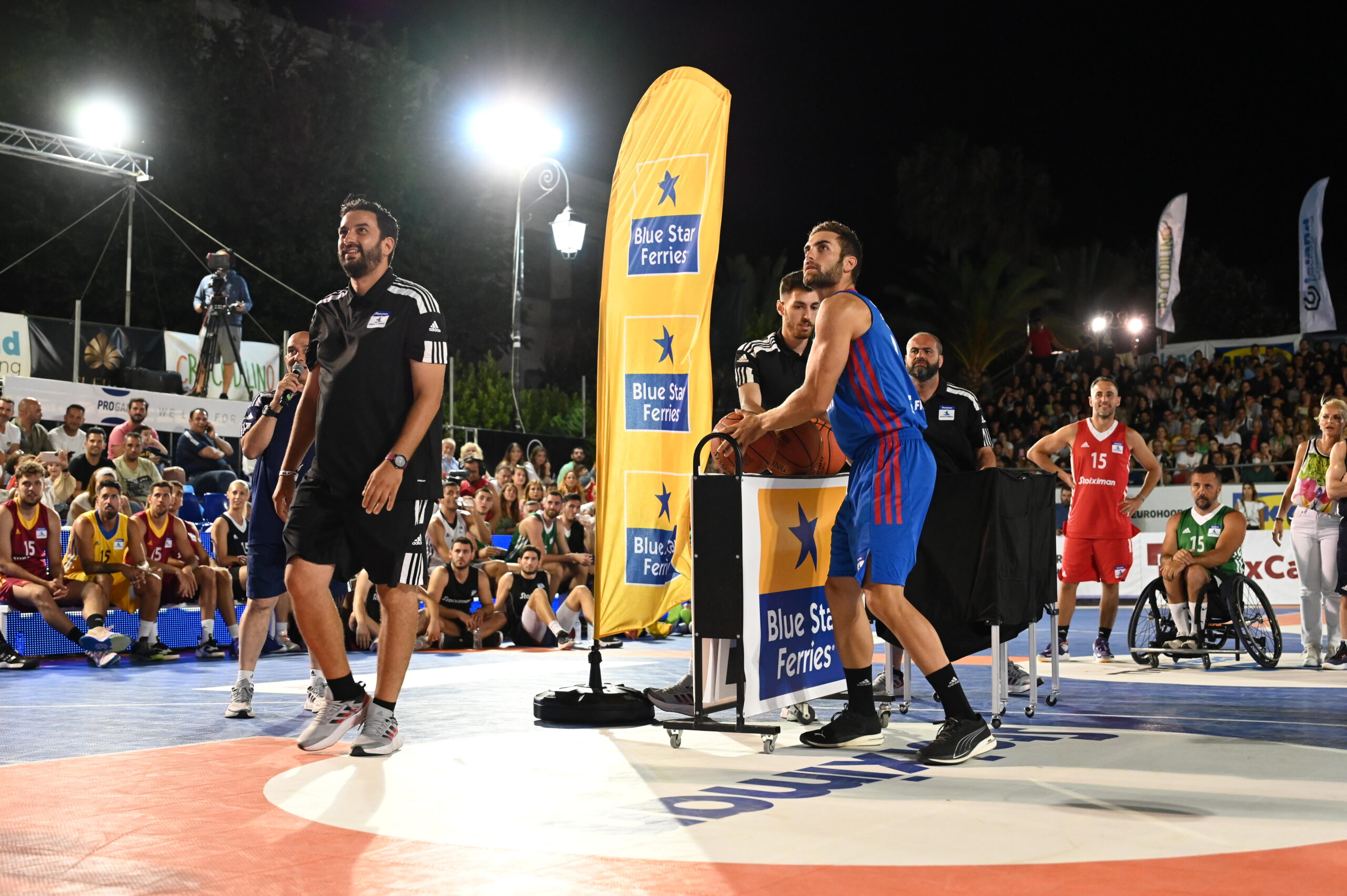 Οι διαγωνισμοί ξεκίνησαν με τα… εύκολα, τον Blue Star Free Throw Contest. Η Μαρία Μπεκατώρου μπήκε στον αγωνιστικό χώρο από την κερκίδα για να αγωνιστεί, η Βασιλική Μιλλούση ενθουσίασε με το μοναδικό της στυλ, όμως, ο Στέφανος Ντούσκος ήταν αυτός που είχε την καλύτερη τεχνική. Ο Χρυσός Ολυμπιονίκης του Τόκιο 2020 πέρασε στον Τελικό με τον Πάνο Κωνσταντόπουλου. Ο Vice President της Stoiximan έκανε σχεδόν το απόλυτο, και με 9 εύστοχες βολές, κέρδισε τον πρώτο διαγωνισμό της ημέρας. Ο Πάνος Κωνσταντόπουλος, μάλιστα, πρότεινε το βραβείο της Blue Star Ferries να δοθεί σε ευαγές ίδρυμα.